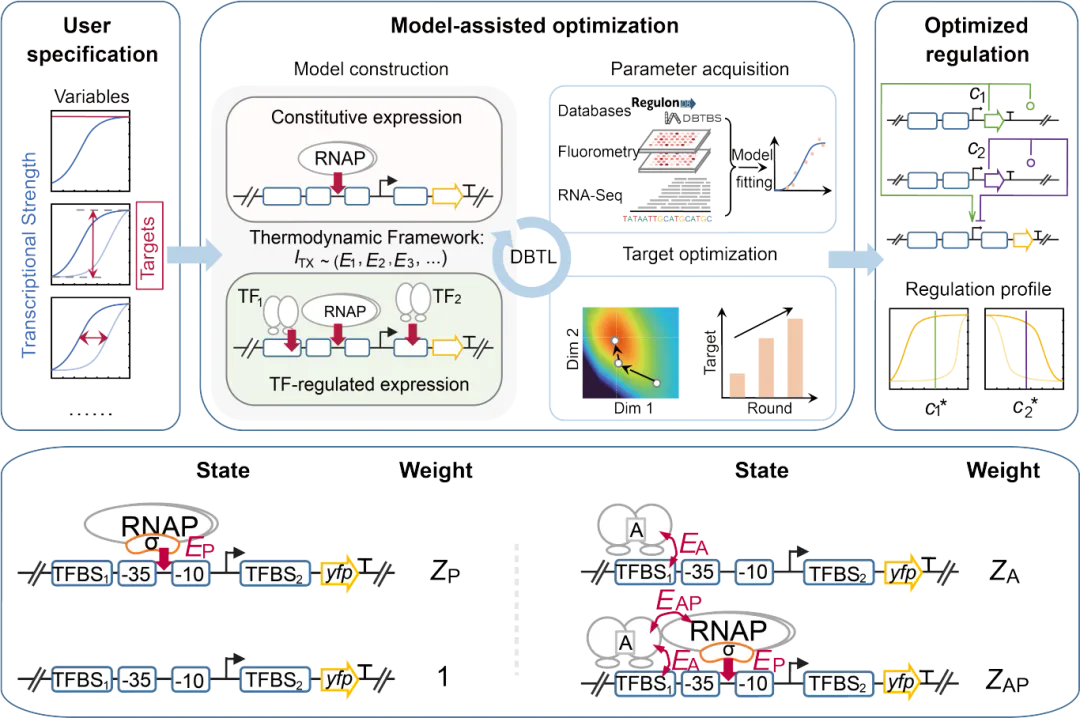 2. “白箱”机制指引理性设计:模型能够识别限制系统性能的“瓶颈”参数(如转录因子与聚合酶的协同作用能EAP或自发寡聚化反应平衡常数K1),为后续优化给予了明确的物理导向——既可直接指导理性设计,也能为“黑箱”模型或进化筛选给予明确的优化目标;